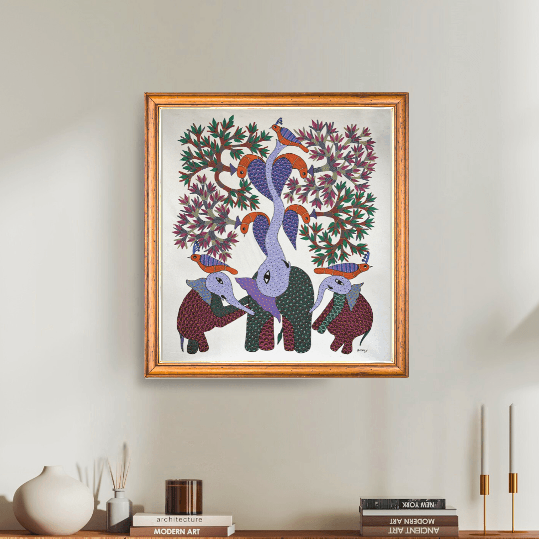 Gond Art Paintings (Madhya Pradesh): Storytelling among the Gond tribe of MP, uses dots, lines and warm colours.