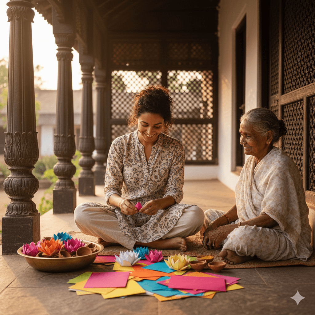 In our busy, screen-heavy lives, art can be a way to slow down and breathe. It doesn’t need to be grand — even a few minutes with pen, paper, or clay can make a difference. Try sketching a small pattern each morning or keeping a doodle journal for a few minutes before bed. Weekend workshops in Pichwai painting, clay modelling, or block printing offer similar moments of pause. Here, learners and artists meet through practice — hands busy, minds calm, curiosity sparked. Family activities can also become creative rituals. Painting diyas together, folding paper flowers, or decorating envelopes with folk patterns doesn’t just make your home festive — it creates shared memories, and a sense of continuity with cultural traditions. Art in these forms isn’t about perfection; it’s about noticing, connecting, and enjoying the process. We promise that art you create is a lot more valuable that art you buy!