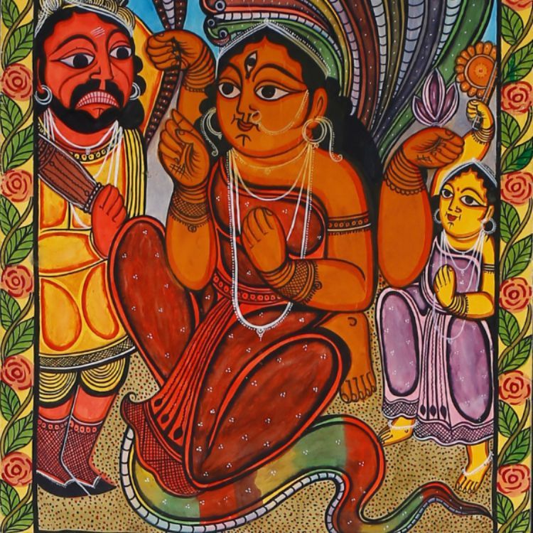 The Manasa Pata prominently features Manasa, the Bengali goddess of snakes. The Kalighat Pata emerged when a group of Patua artists settled around the Kalighat temple. Jama Patas show different variations of the god of death, Yama, and his servants doling out punishments in hell.