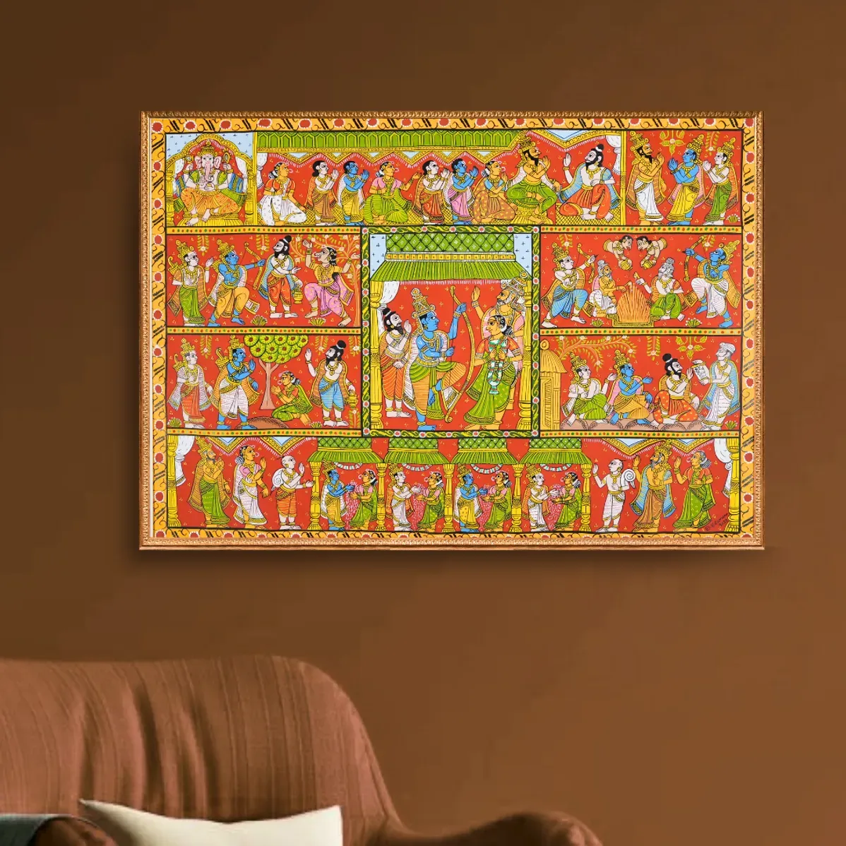 After this, the story begins in earnest. The first frame shows Lord Ram, his brothers, and parents greeting Guru Vashishta. Again, the painting says much without really saying anything at all. It is clear to the knower of the tale that Vashishta has come to bless the young princes. In the very next frame, we see Lord Ram and Laxman taking their leave from their father, the King, to begin their Brahmacharya life under the guidance of Vashishta. The frames go on in chronological succession, depicting with clarity how the tale goes. It is an interesting feature of the Cheriyal art form that it does not quite give you everything, leaving much to the imagination. In this case, we see no surrounding details of the ornate palaces and the dense forests. They are hinted at with simply a solo tree, a curtain, or a pillar. And yet, in a complex contrast, the things that are portrayed are detailed to a tee. The royals with their heavy ornaments, each of their drapes accentuated. Whether it is the fine detailing or the overall picture, this masterfully created painting by the master artist D. Venkatraman has proved itself a masterpiece.