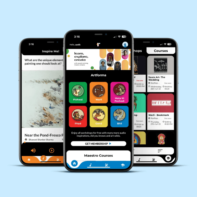 If you’re someone who’s all about that base and looking for in-depth learning, Rooftop offers a variety of courses where you can dive deep into the details. Our Maestro Courses are taught by award-winning maestros in different languages. And they offer holistic learning of art forms like Gond, Bhil, Phad, Pichwai, Mata ni Pachedi, Fresco, Warli, Cheriyal, and Madhubani (with many others coming soon!)