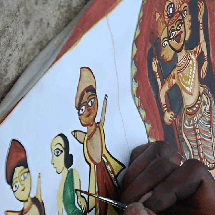 The artists behind Jadopatua painting are of Bengali descent, primarily from the Santhal tribe, who migrated to Jharkhand centuries ago. This community of painters, known as Jadopatua, includes individual artists referred to as 'chitrakars'. The traditional artworks of this region are known as 'Paitkar', a form of art that has been practiced in the village since ancient times. The hamlet of Paitkar, located in the eastern part of Jharkhand, is called Amadubi. Jharkhand tribal artisans have cultivated the art of scroll painting, which has long been employed in storytelling and socio-religious rituals. Paitkar painting is derived from Pandulipi (ancient scrolls), which were once used by kings to send messages to one another. This painting in santhal tribe was created by a group of people known as Jadu patuas who live in santhal prangan. It is said that the name "Jadopatua" was first coined by Nitai Chitrakar, a painter from West Bengal.