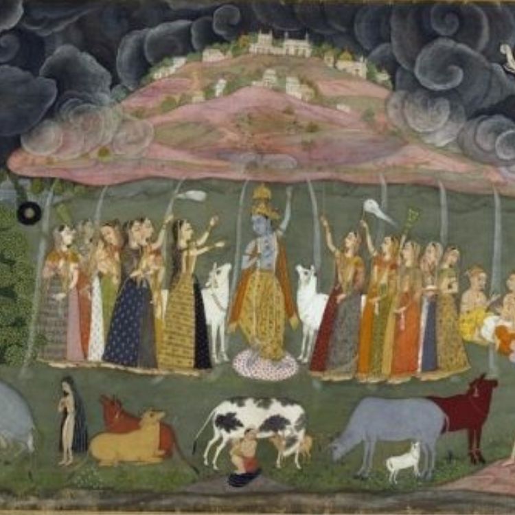 Krishna lifts Mount Govardhan by Ustad Sahibd, Bikaner, c. 1690. (Image source: British Museum)