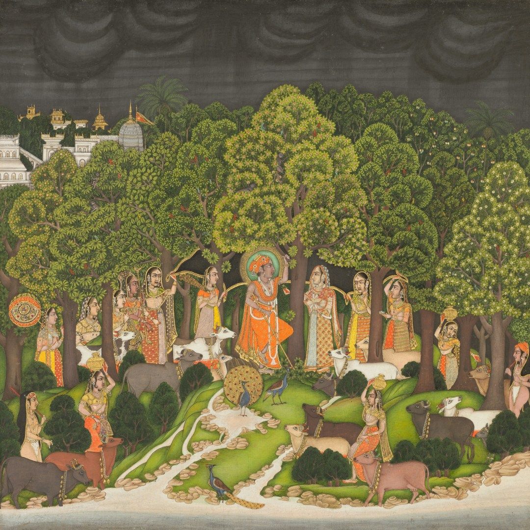 Kishangarh’s style, led by Raja Savant Singh and artist Nihal Chand, is famous for its poetic beauty. The paintings often showed Radha and Krishna in glowing landscapes, with delicate features and a romantic, dreamlike charm.