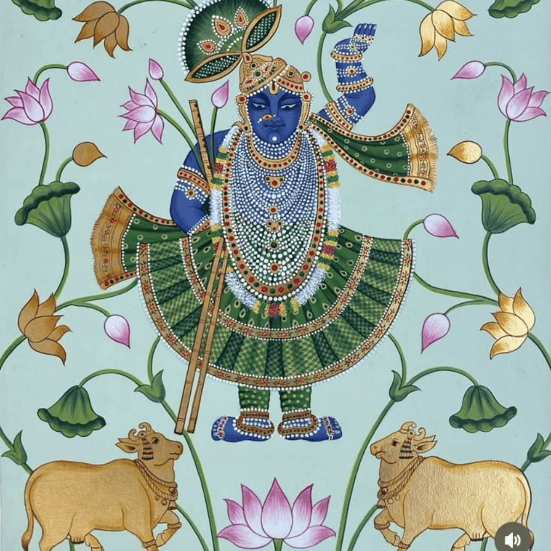 Pichwai paintings from Nathdwara, Rajasthan, depict Lord Krishna's Shrinathji form with intricate designs, rich colours, and deep spiritual symbolism.