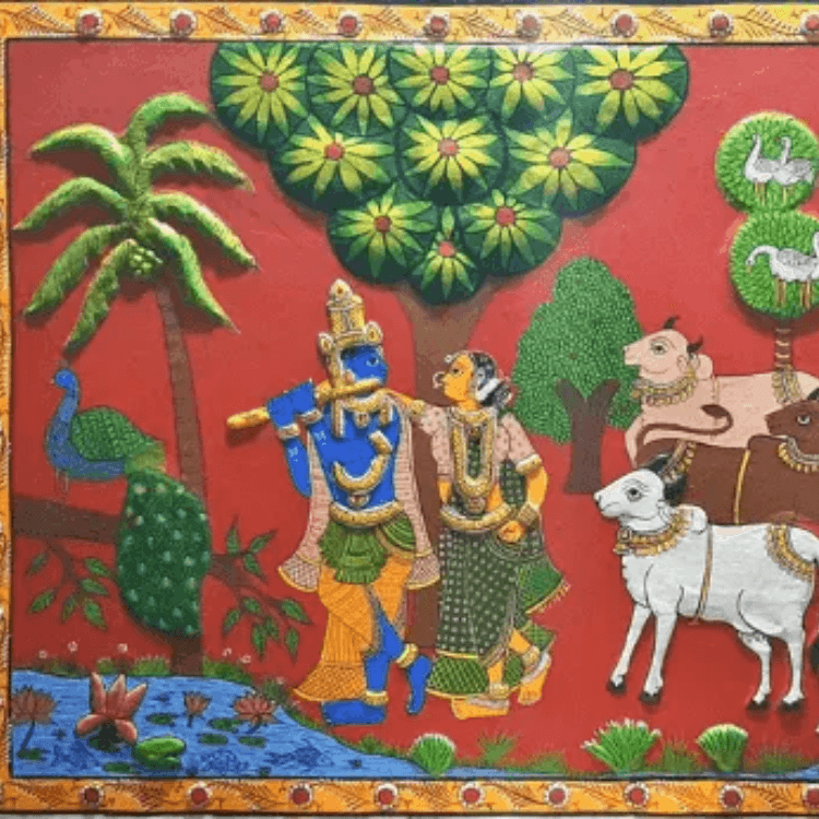 The stunning attraction of Cheriyal scrolls is due to their wholly environmentally friendly and sustainable components. The narrative is typically depicted in a sequence of horizontal panels. The flower border in the middle and resembles modern comic strips divide them. The scrolls are typically created in a vertical arrangement. The scrolls were frequently shown by hanging them from a tree and revealing them panel by panel as the events were narrated. Such type was most common during the nineteenth and twentieth centuries.