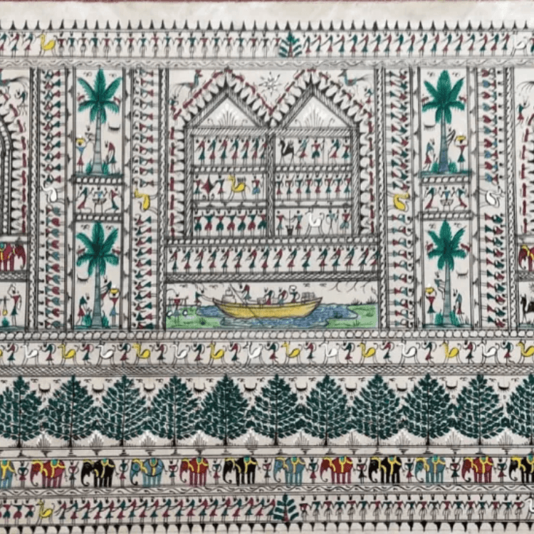Saura paintings have a more elegant and refined look. The designs are compact with minimal negative space. Rows of triangles are used for the outer borders. Saura art was created for religious and ritualistic purposes, and we observe this through the elaborate and tightly packed designs. We see triangle-shaped human figures in action that are static when compared to their Warli counterparts. Thus, Saura art communicates that the close-knit community is bound together by rituals and tradition.