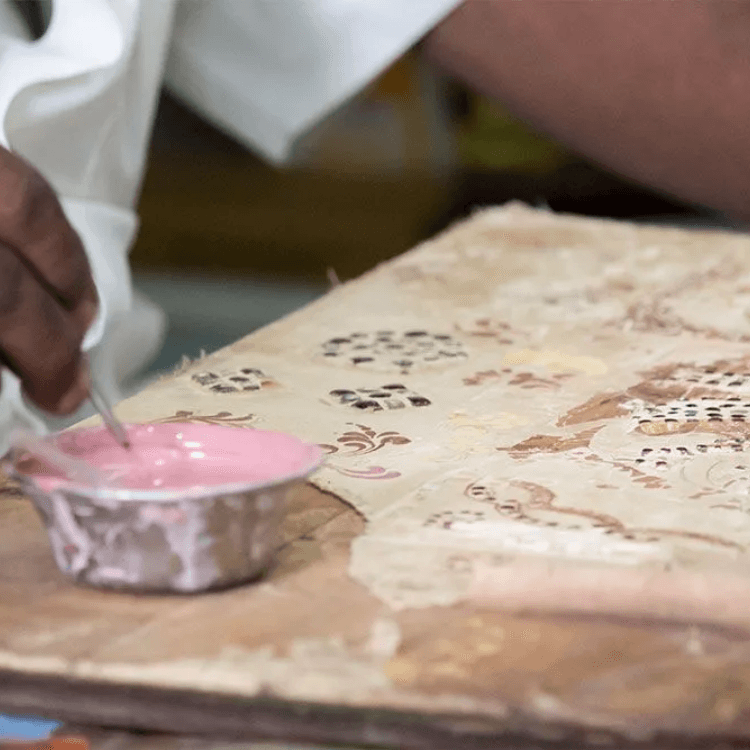 Tanjore paintings are well recognised for their rich representations of deities employing vivid colours and flashy ornaments, particularly gold foil. Golden Tanjore paintings are known as 'Palagi Padam', which translates to image on a wooden plank. They are traditionally still created on boards made from jackfruit or teak wood, even after going through numerous changes over the years. Moreover cut glass, pearls, precious gems, and semi-precious stones as additional decorative elements.