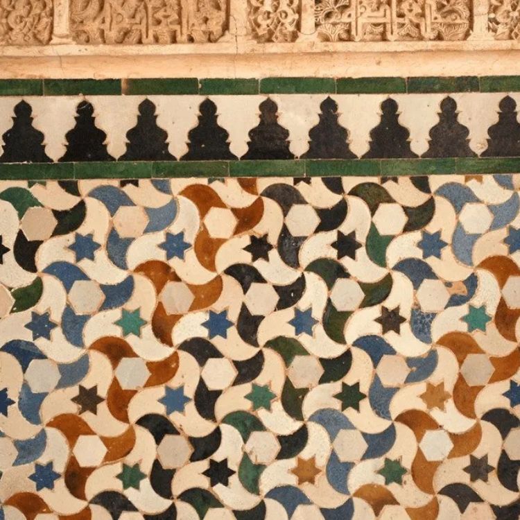 The South of Spain, i.e. - The Andalusian region had a big appetite for tile art, through the Moorish perspective. The designs seen in the Alhambra in Granada and the Mezquita in Cordoba are some examples of the Islamic influences on the tiles in these grand Moorish structures, circa 13th century. The mosaic tile technique used in Alhambra, Spain is also referred to as alicatado, a Spanish word deriving from the Arabic verb qata'a meaning "to cut". The tiles witnessed here are heavily studded with an abundance of colours and patterns. The geometric nature is a key takeaway from this style of tile art, which is quite a symbolic Islamic note of unity and order. The walls are accompanied by inscriptions of Arabic script, carved into the tiles, known to be poetry and verses from the Holy Quran.