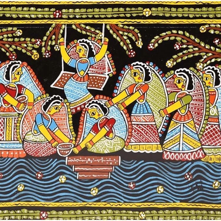 Some artists use Madhubani painting techniques and motifs in Tikuli art. These art forms are women-centric, and the similar styles make the resulting artwork look beautiful and harmonious. Lotus flowers are a recurring motif in this folk art form. Gods, goddesses, village life, as well as festivals, rituals, wedding scenes, and myths, feature in this art form.