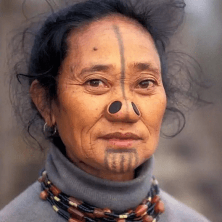 In the Ziro Valley of Arunachal Pradesh, the Apatani tribe has a rich tradition of tattooing that holds deep cultural significance. These tattoos, which extend from the forehead down to the nose, lower lip, and chin, are powerful symbols of their identity. While both men and women in the community had tattoos, facial tattoos were particularly important for women and they often wore wooden plugs in their nostrils to make them less attractive to rival tribes that might abduct them. Appatani have mythical tales associated with these tattoos, according to some legends, when men died in skirmishes with other groups, their spirits would return to search for the wives they had left behind. If they couldn’t find them, these spirits would cause disturbances in the village. To protect the community, a priest advised the women to get facial tattoos, making them unrecognizable to the spirits, so they would leave the village peacefully. These tattoos were received by women at the age of 10. Women typically received these tattoos at the age of 10. The ink used was a mixture of soot, known as chinyu, and animal fat. The tattooing process involved a three-headed thorn needle, called tipe-tere, tied together and tapped into the skin with a small stick hammer known as empiaa yakho.