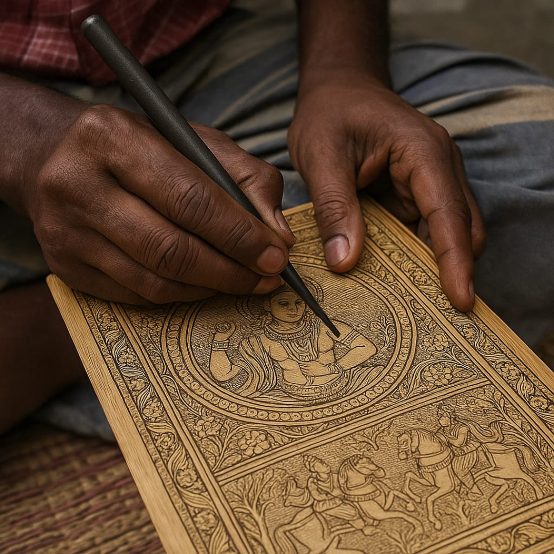 This experience guides you into the world of palm leaf engraving, an age old tradition where stories, symbols and intricate patterns are carved into dried palm leaves. In Jitendra Kumar Parida’s workspace the process begins with selecting the right leaf, smoothing its surface and preparing it for fine incisions. The craft relies on calm precision as each line is etched with a metal stylus. Pigment settles gently into the grooves, revealing the design in quiet contrast. Themes often draw from mythology, folklore and daily life, creating a visual language unique to Odisha. A small engraved motif is completed during the session. The final piece carries both texture and history, reflecting a practice that has endured across generations. What it Covers • An introduction to Odisha’s palm leaf engraving tradition and its narrative roots • A look at how palm leaves are treated, dried and prepared for work • Insight into the tools used for engraving and how lines are etched with control • Exposure to pigment application that brings the carved details to the surface • An understanding of how motifs and symbols are composed in this traditional form