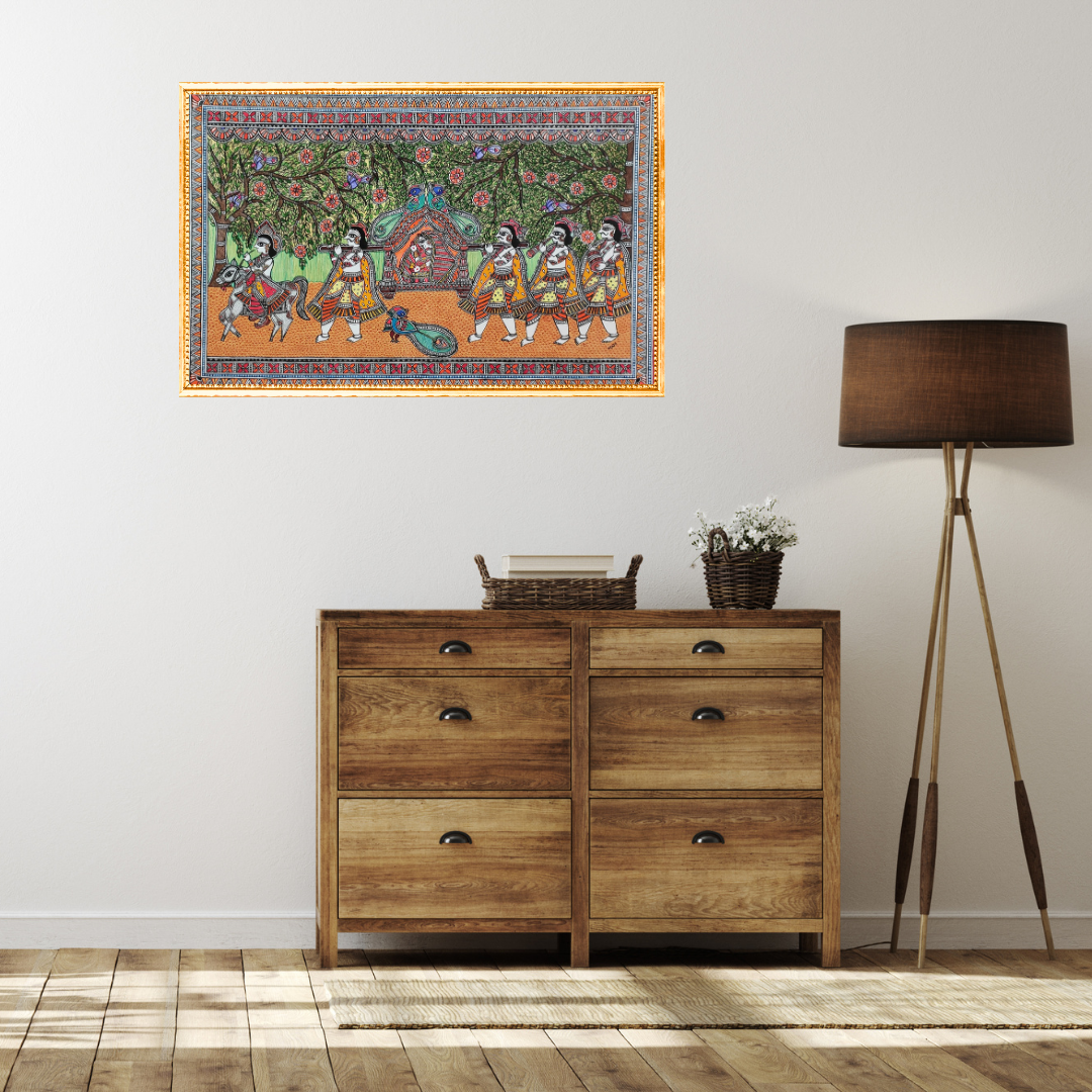 This vibrant Madhubani painting titled “Doli-Kahaar” beautifully depicts a tradi...