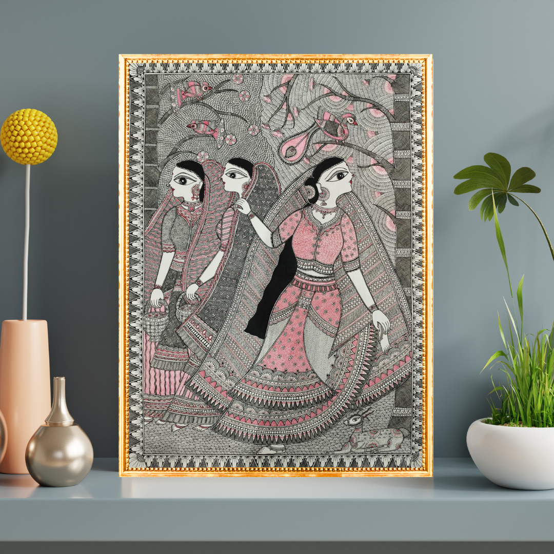 This beautiful Madhubani painting titled “Love at First Sight” captures a timele...