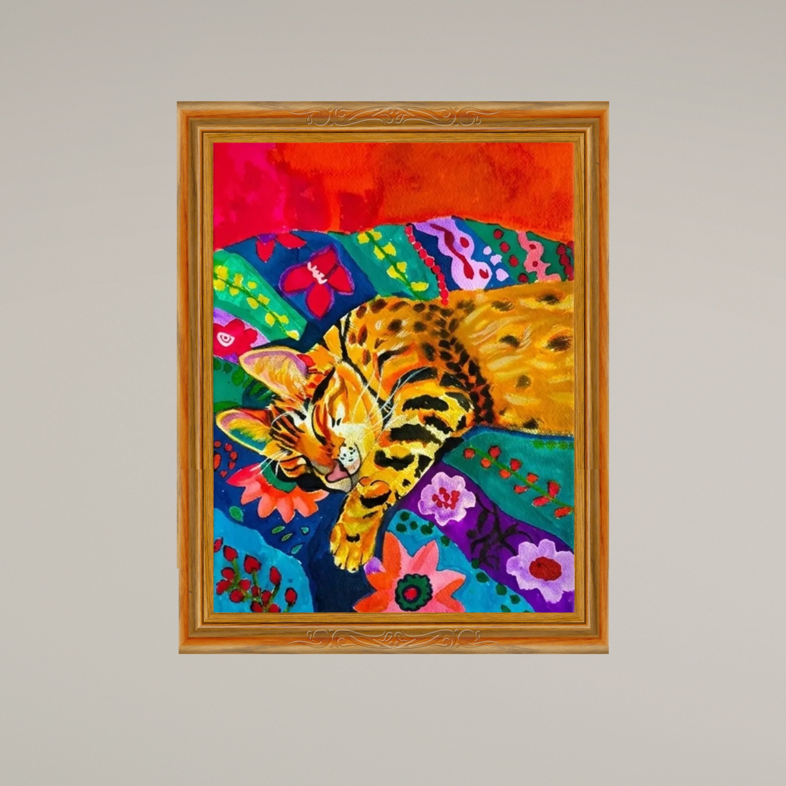 Dreamy Catscape” is a unique hand-drawn ink artwork created on premium watercolor paper. This piece beautifully blends bold colors, intricate patterns, and a peaceful cat motif, making it a perfect statement artwork for modern and artistic interiors. The composition reflects comfort, imagination, and joy — ideal for art lovers, pet lovers, or anyone who enjoys expressive and colorful décor. Each detail is carefully crafted, making this artwork truly one-of-a-kind and irreplaceable.