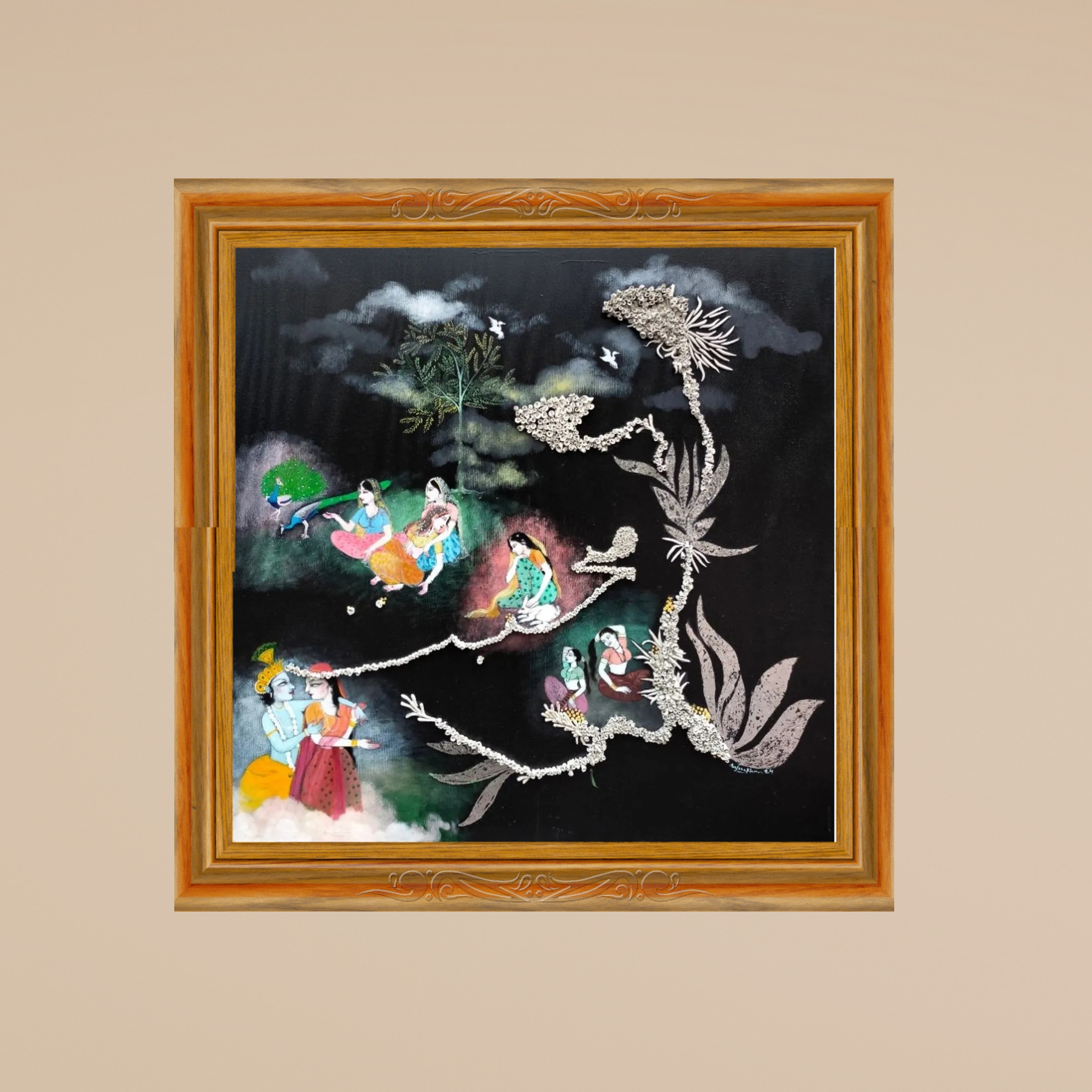 Anjum Khan’s figurative artwork brings together narrative charm, emotional detail and traditional Indian visual elements. The painting beautifully balances expressive characters, symbolic motifs and rich color tones to create a scene that feels both timeless and lyrical. The artist’s fine detailing, layered forms and contemporary reinterpretation of classical style make the artwork visually engaging and culturally resonant.