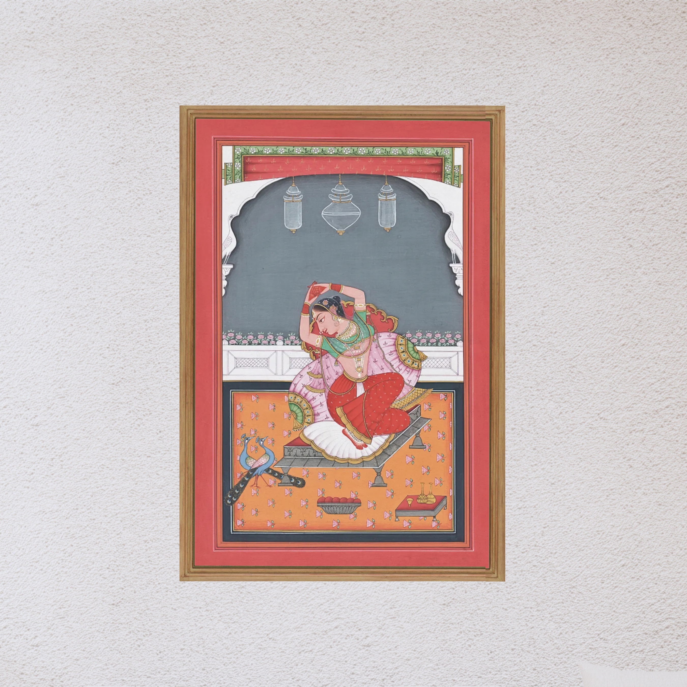 A solitary woman stands within a quiet courtyard, caught in a moment that feels both intimate and unguarded. In NAYIKA-01 Yawning Nayika in Kotah School, the figure stretches slightly as she yawns, her posture relaxed and unselfconscious. The gesture is simple yet revealing, capturing a moment of everyday human experience rarely emphasized in classical painting. Draped in flowing garments and adorned with delicate ornaments, the nayika appears suspended between wakefulness and reflection, as though the stillness of the surrounding space has gently slowed time.