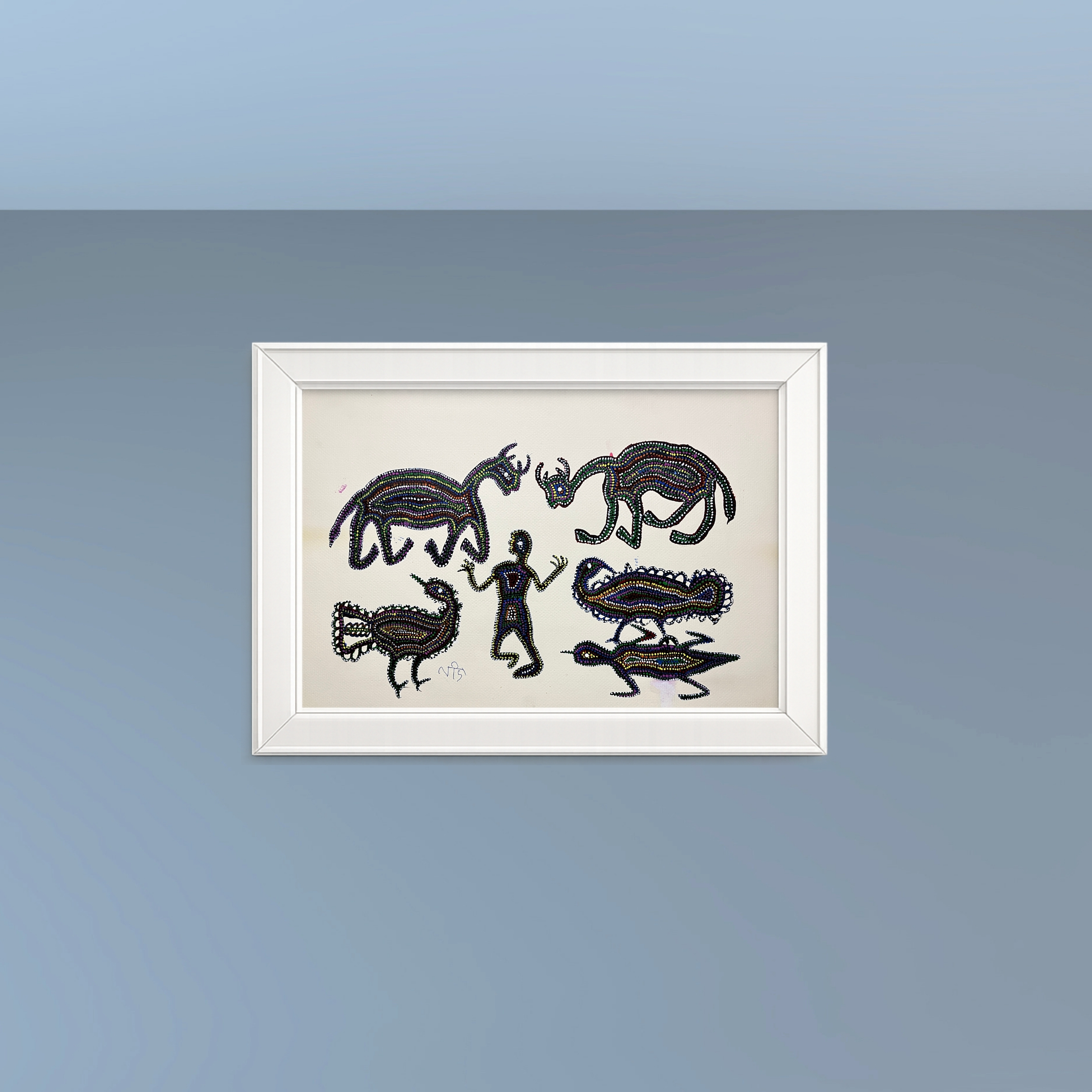 Dark, banded creatures surround a solitary human figure at the centre of this handmade painting by Lado Bai, their bodies rendered in deep black and dark green with rows of jewel-like dots in white, yellow, orange, purple and blue that glow against the darkness of their forms like embers or distant stars. Two large, horned animals dominate the upper half of the composition, their limbs angular and alert, while two smaller spiny creatures occupy the lower corners, their open mouths lined with teeth-like points. The human figure stands between them with arms raised, its body patterned in the same dark, dotted language, neither fleeing nor commanding but simply present within this nocturnal gathering. Painted in acrylic on paper, the composition evokes the Bhil experience of the forest at night, a world of sounds, shadows and presences that are felt before they are seen.