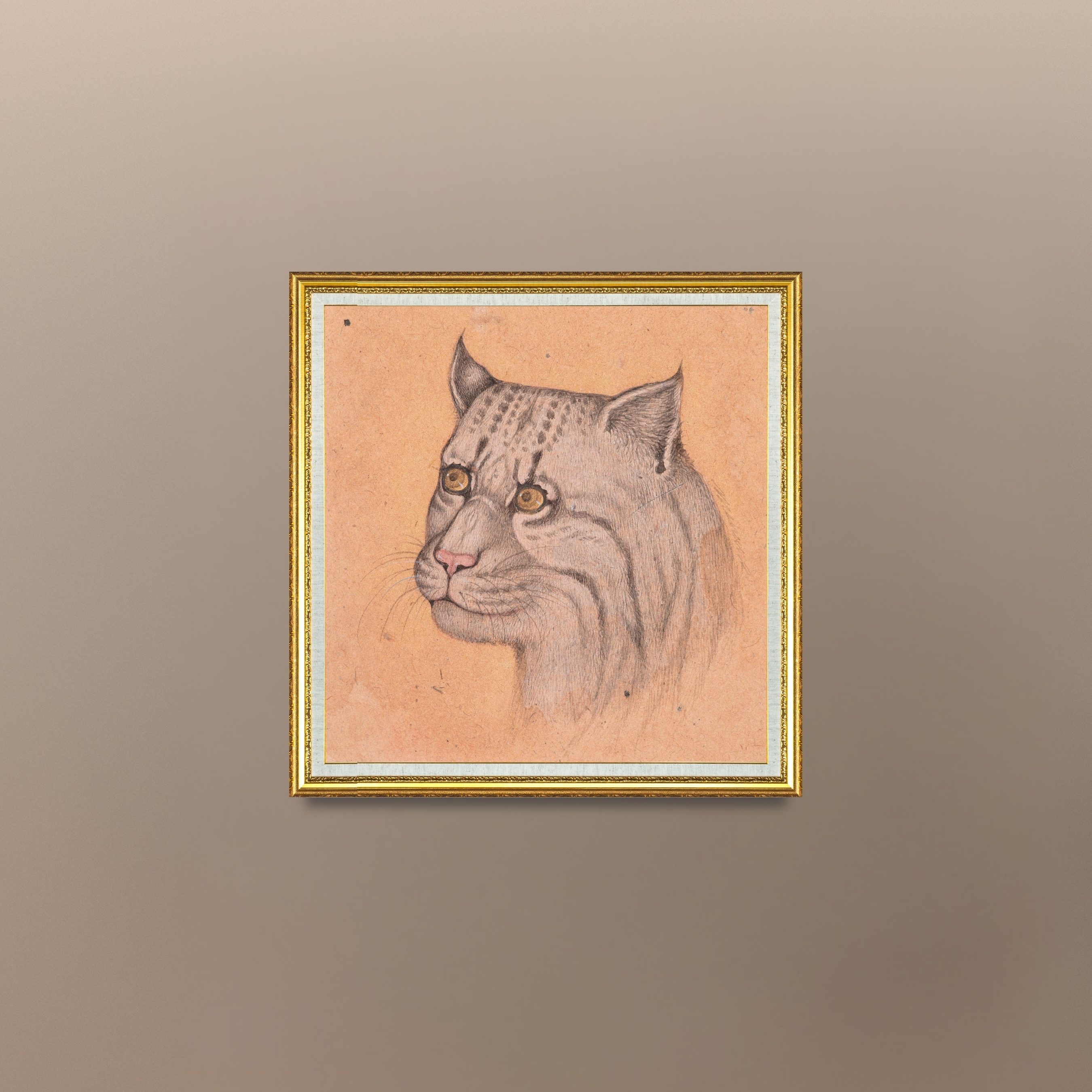 The pale coat carries subtle striping that blends into the warm tone of the handmade paper. The artist’s ink work creates smooth transitions in the fur, giving depth without overwhelming the softness of the face. The pink nose, light whiskers and attentive ear details add just enough definition to give personality and presence.
