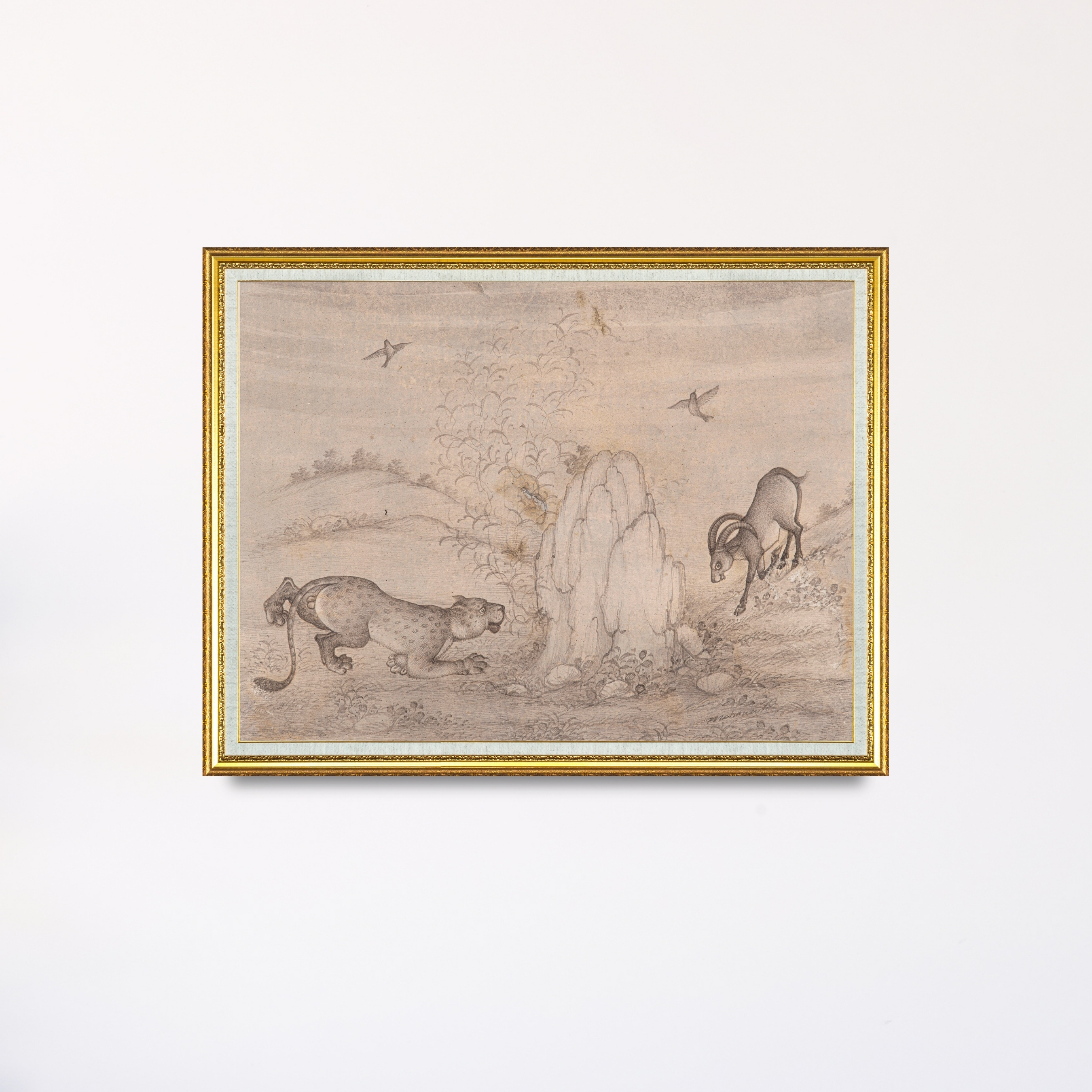 The backdrop is filled with pale hills and delicate foliage that create a calm, open atmosphere. Three birds glide through the sky, adding lift and movement to the otherwise quiet scene. The natural black ink on old handmade paper gives the artwork a classic, archival clarity that highlights every curve of muscle, rock and branch.