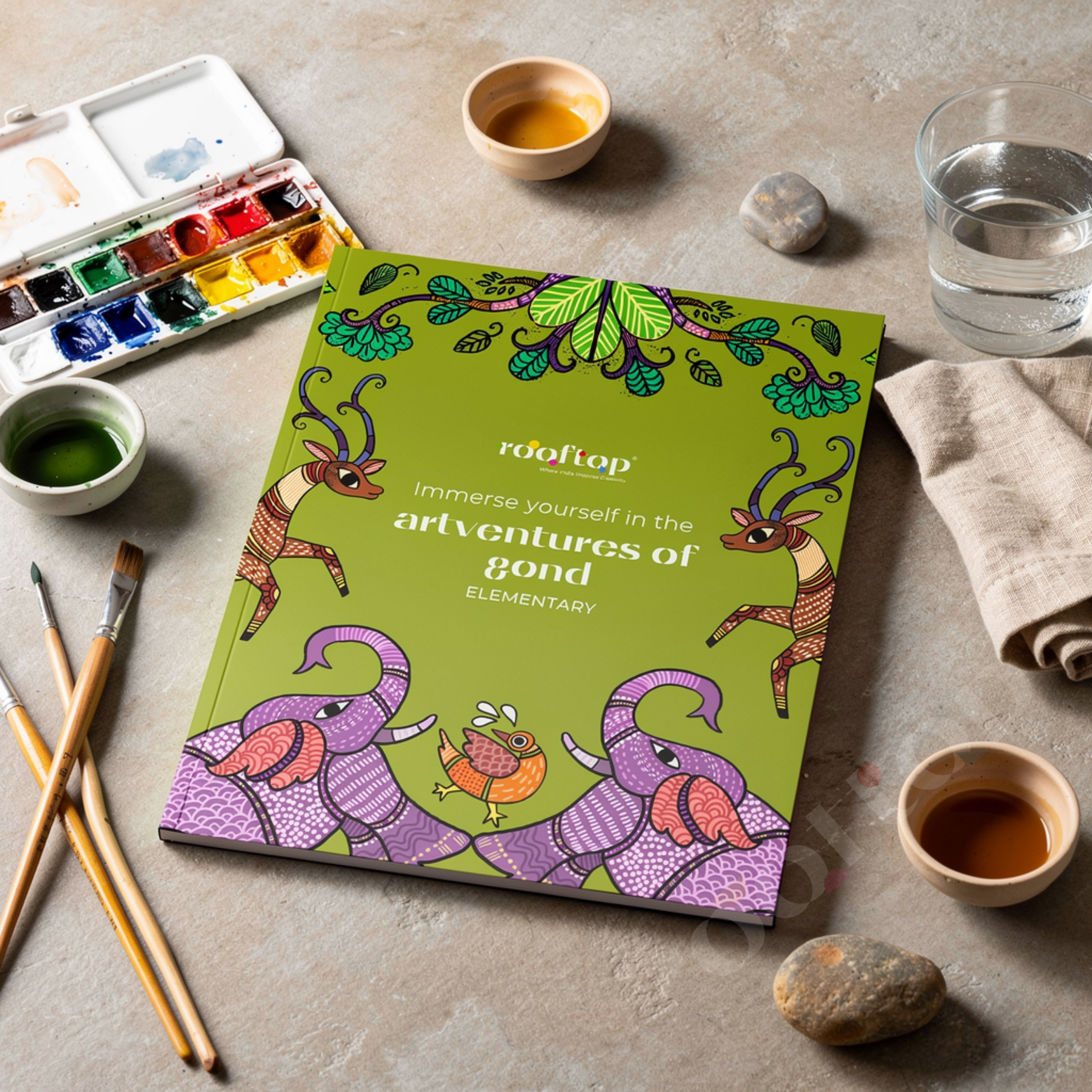 The Artventures of Gond - Elementary is a fun, easy-to-follow art book that introduces children and beginners to the vibrant world of Gond art, an ancient tribal art form from central India. Explore the vibrant world of Gond art as a beginner with Golu’s engaging stories, introducing the origins and history of this tribal art form. Learn six patterns through step-by-step instructions, practice drawing iconic motifs like fish, peacocks, and birds, and enjoy ample space to refine your skills. The book features creative challenges, including connect-the-dots and complete-the-composition activities, designed to keep children engaged as they learn. Perfect for beginners, this journey encourages creativity and helps you design your own Gond-inspired masterpieces.