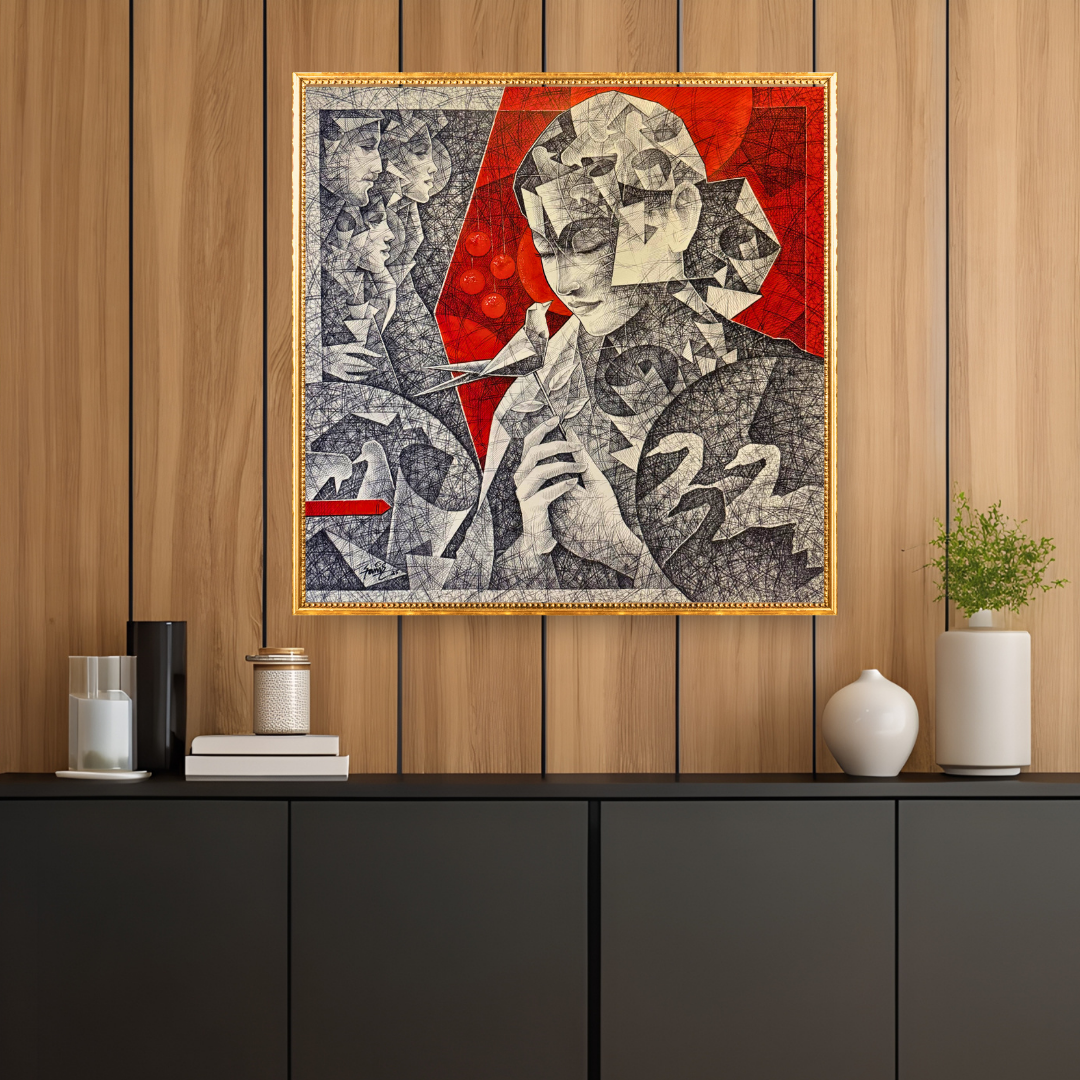 Ajay Samir's 'Divine Dialogue' presents a harmonious, introspective moment where the human spirit connects with nature. The artwork uses an intricate network of lines and geometric fragments to evoke a sense of rhythm and contemplation. A soft interaction between the figure and a bird symbolizes purity, connection, and inner peace. The emotional depth is amplified by the interplay of red and monochrome tones, reflecting a balance between thought and feeling.
