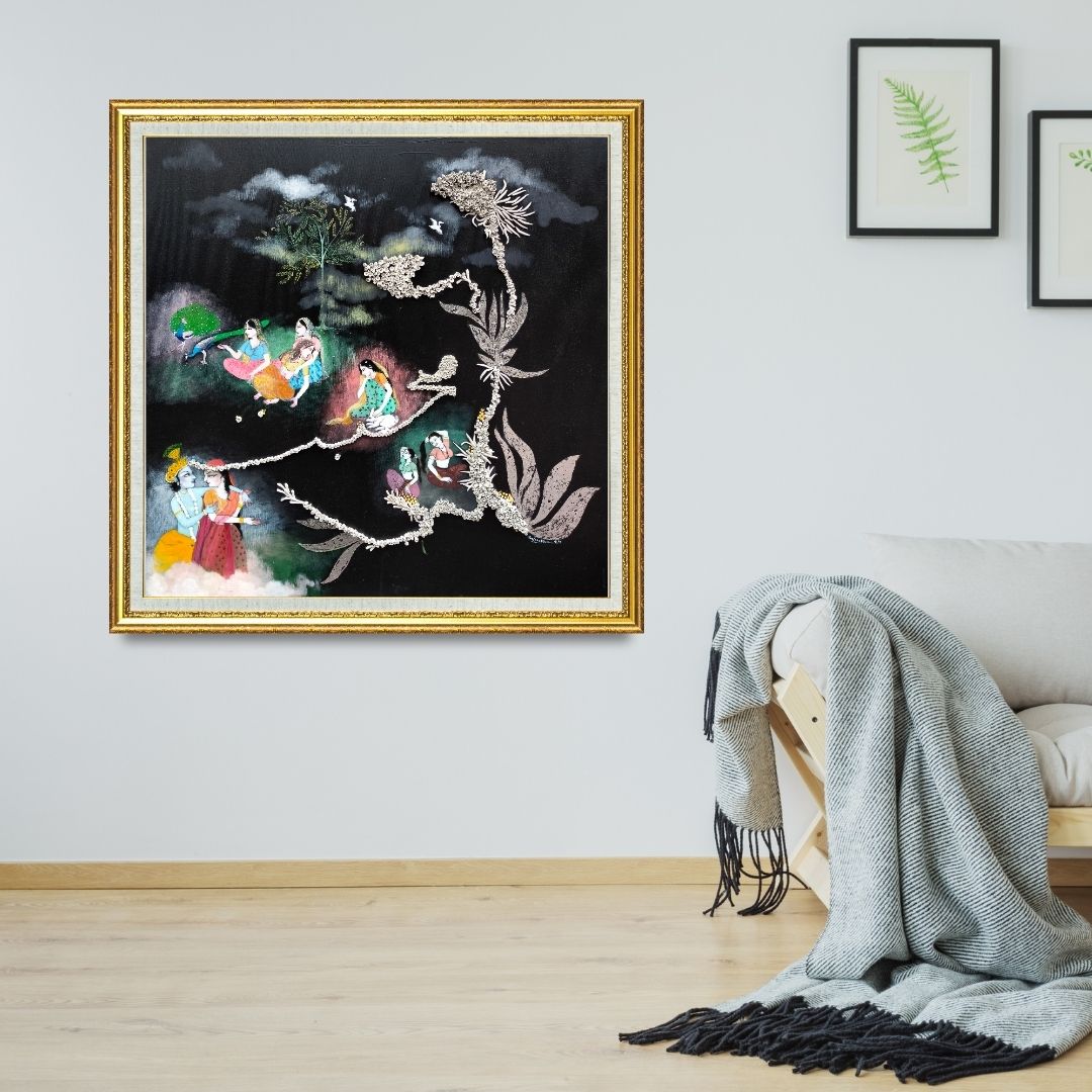 Anjum Khan’s figurative artwork brings together narrative charm, emotional detail and traditional Indian visual elements. The painting beautifully balances expressive characters, symbolic motifs and rich color tones to create a scene that feels both timeless and lyrical. The artist’s fine detailing, layered forms and contemporary reinterpretation of classical style make the artwork visually engaging and culturally resonant.
