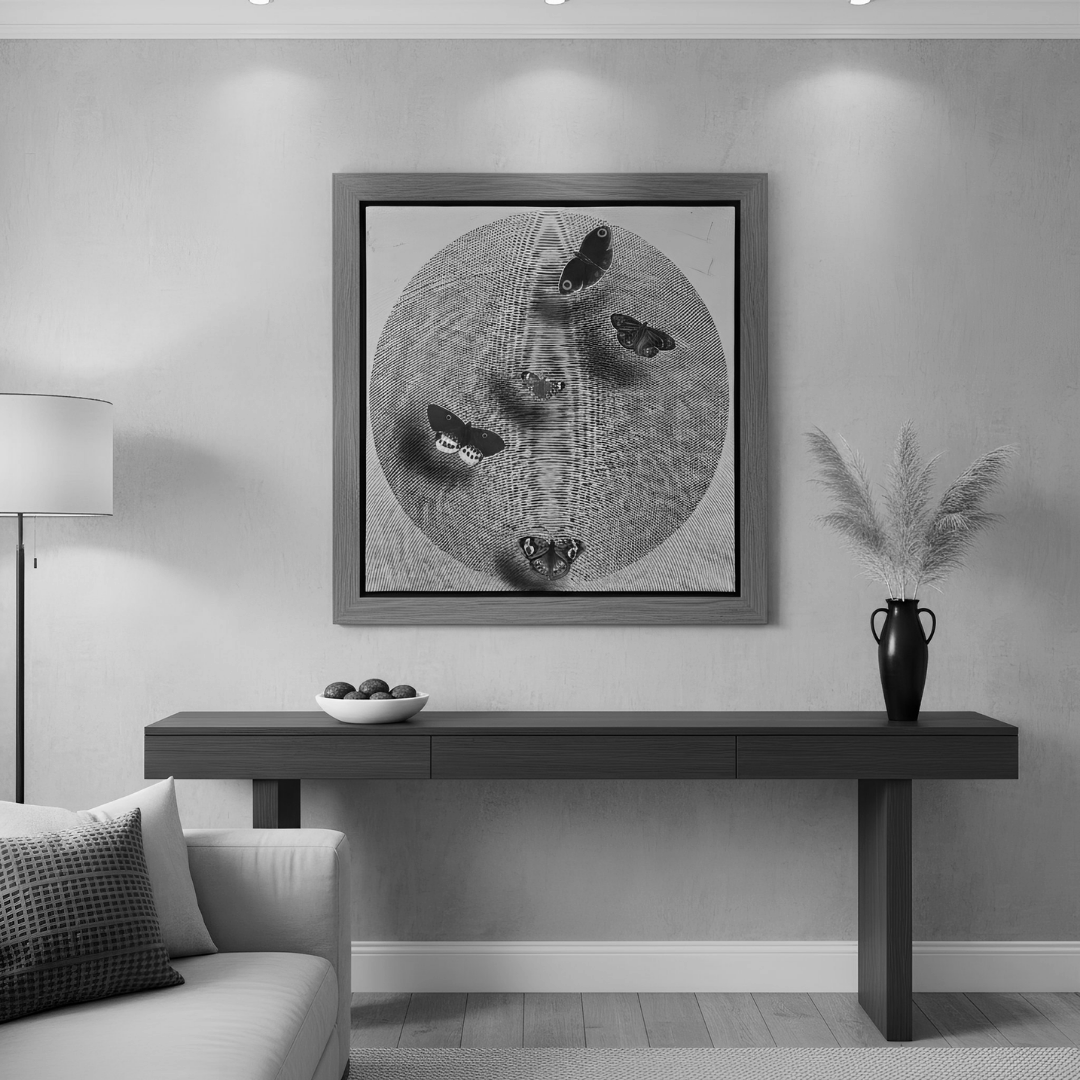 Their placement invites slow looking, as if they are responding to the invisible frequency surrounding them. The linear drawing forms a steady vibration beneath their wings, suggesting subconscious movement rather than a literal scene. The work becomes both a visual rhythm and an emotional space, letting viewers experience calm, curiosity, and inner motion without a fixed narrative. It is a contemporary piece that rewards repeated viewing and personal interpretation.