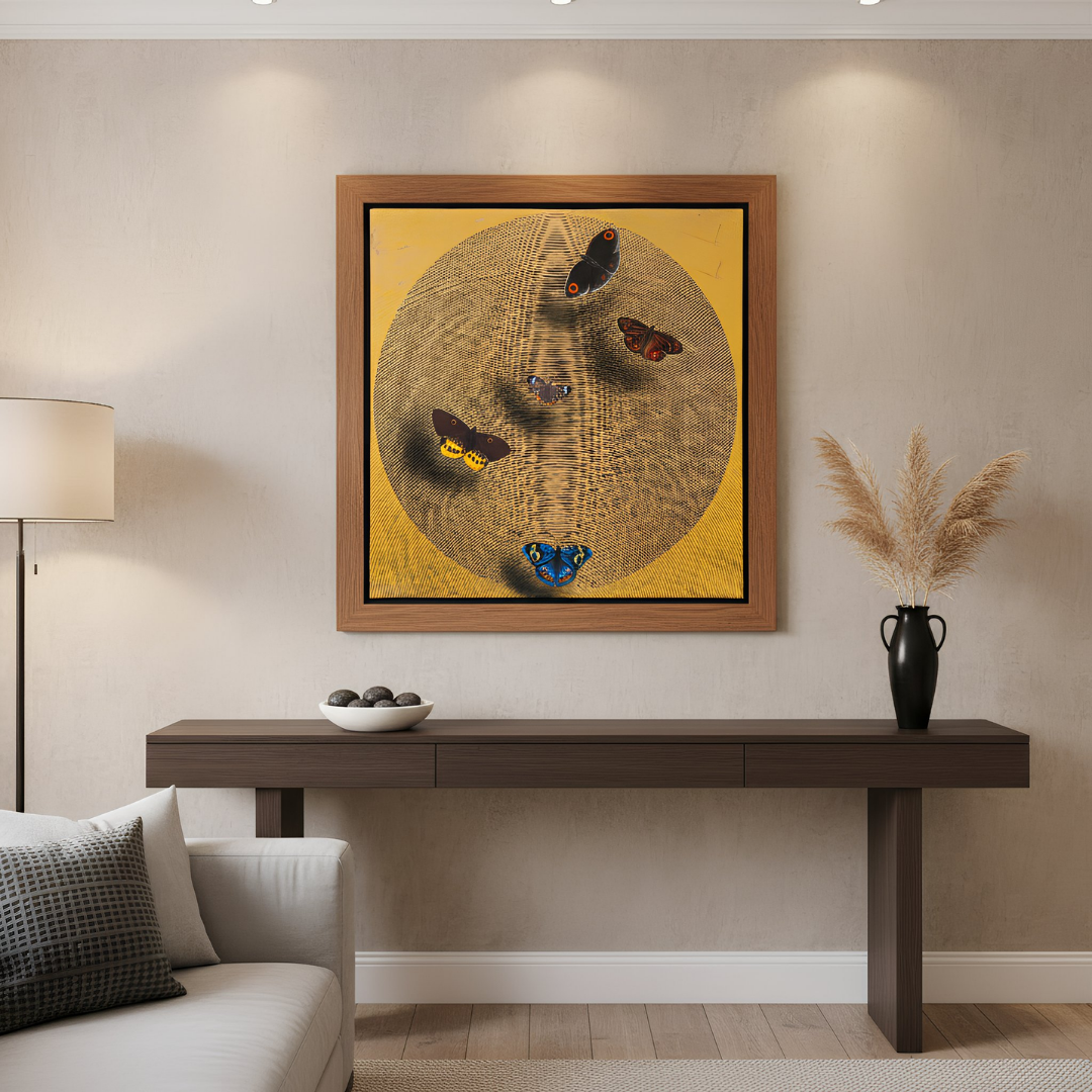 Happy Vibration 55 by Ghanshyam Gupta brings together the precision of linear mark-making with the delicate presence of butterflies. The artwork builds a circular field of pulsating lines that seem to expand and contract like a living surface. The colour shifts inside the sphere create a sense of rotation and subtle energy, almost like watching a globe hum quietly in motion. The butterflies appear suspended within this current, each one rendered with careful attention to texture, colour, and individuality.