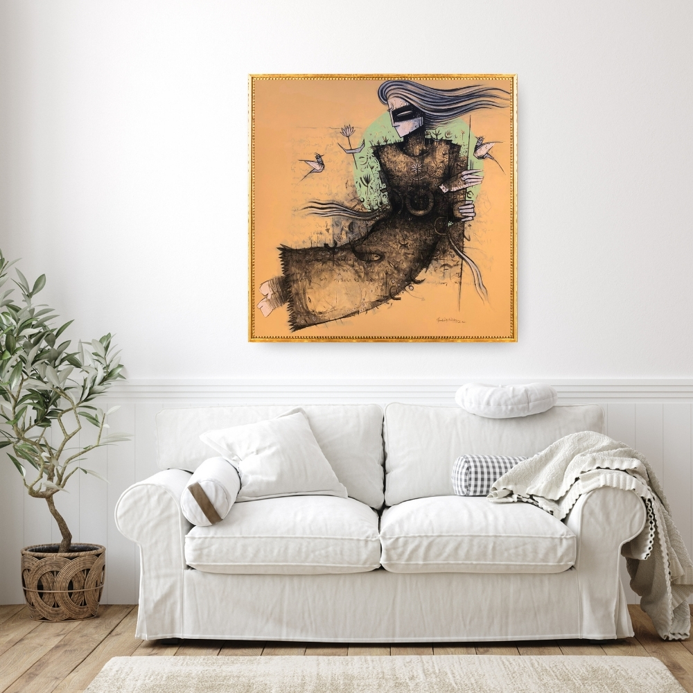 Ambrish Mishra's 'Human with Nature' series features this artwork that powerfully symbolizes the connection between humanity and the natural world. Through dynamic strokes and rich textures, the piece creates a sense of movement with bold, fluid lines, while intricate patterns foster a deep, personal bond with the environment. A serene, earthy color palette enhances the thoughtful visual experience. Mishra's distinctive style imbues the figure with vitality, merging modern abstraction with traditional essence.