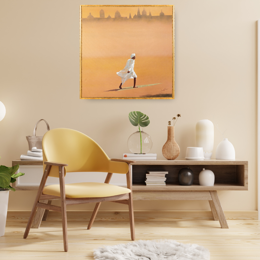 Douglas John’s 'Inner Divinity – B' depicts a solitary figure walking resolutely through a sprawling, sunlit landscape. The interplay of light and warm ochre hues, combined with the simplicity of the form, creates a sense of meditative tranquility. In the background, silhouettes of sacred architecture suggest an inner pilgrimage—a spiritual journey towards awakening, marked by faith, solitude, and serene strength.