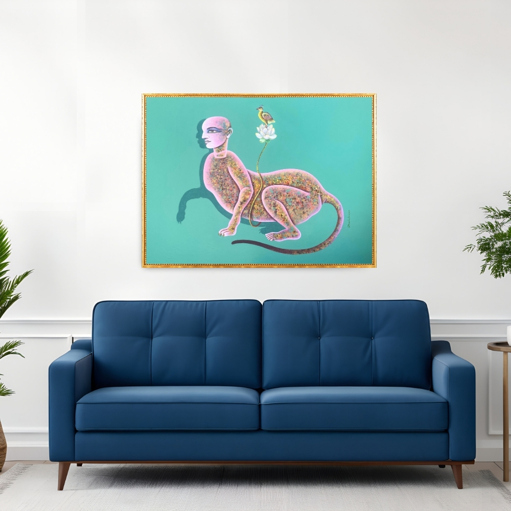 In Dharmendra Kumar’s 'Morning Walk – 2', human, animal, and botanical forms merge in a surreal dreamscape of coexistence. The figure, a vessel of life and transformation, is depicted in quiet motion, its textured body blossoming with organic patterns and vibrant color. A delicate bird resting on a lotus adds to the sense of serenity and rebirth, reflecting the artist’s vision of harmony between nature and the inner self.