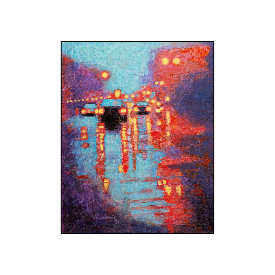 Traffic Lights by Vandana Krishna is a vibrant, impressionistic depiction of a city street at night during a rainstorm. The painting features the glowing headlights and taillights of cars reflected in the wet pavement, creating shimmering streaks of red, gold, and blue. Through its dense, textured brushwork and a rich palette of deep purples and bright ambers, the work captures the rhythmic energy and blurred atmosphere of urban life in motion.