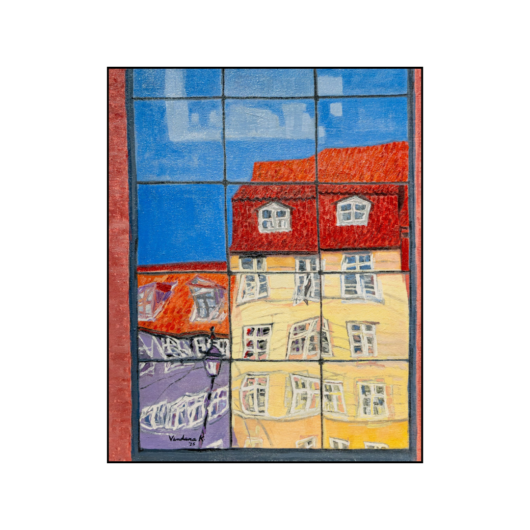 Windows by Vandana Krishna is a vibrant urban study that captures the distorted reflection of historic, red-roofed buildings on the grid-like surface of a modern glass window. The composition uses a bold primary palette, contrasting the bright blue sky and warm yellow facades with the dark lines of the window panes. Through this layered perspective, the artist creates a rhythmic visual dialogue between the solid reality of the viewer's space and the shimmering, mirrored world of the city outside.