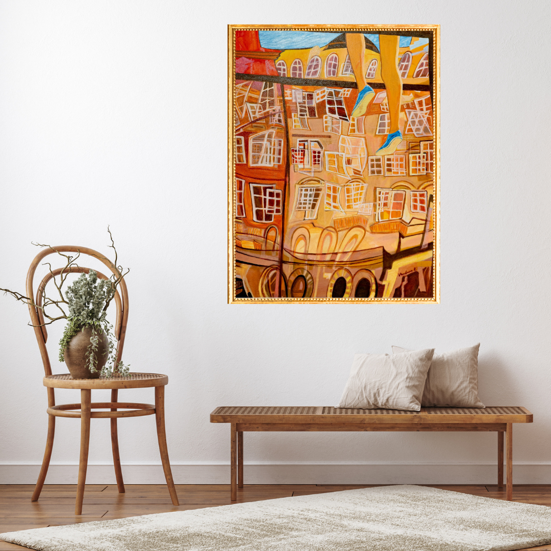 Two legs descend from the top of the composition, blue shoes catching the eye before anything else. The figure is mid-balance, mid-crossing, the body above the frame and therefore imagined rather than seen. Below, an entire city unfolds at the wrong angle, its warm ochre and orange buildings tilted and compressed into a vertiginous downward view, windows multiplying across every surface at every angle, no two quite parallel, the whole urban mass seen the way only someone suspended above it could see it. The perspective is not accidental distortion. It is the specific, earned view of someone who has chosen the rope over the pavement.