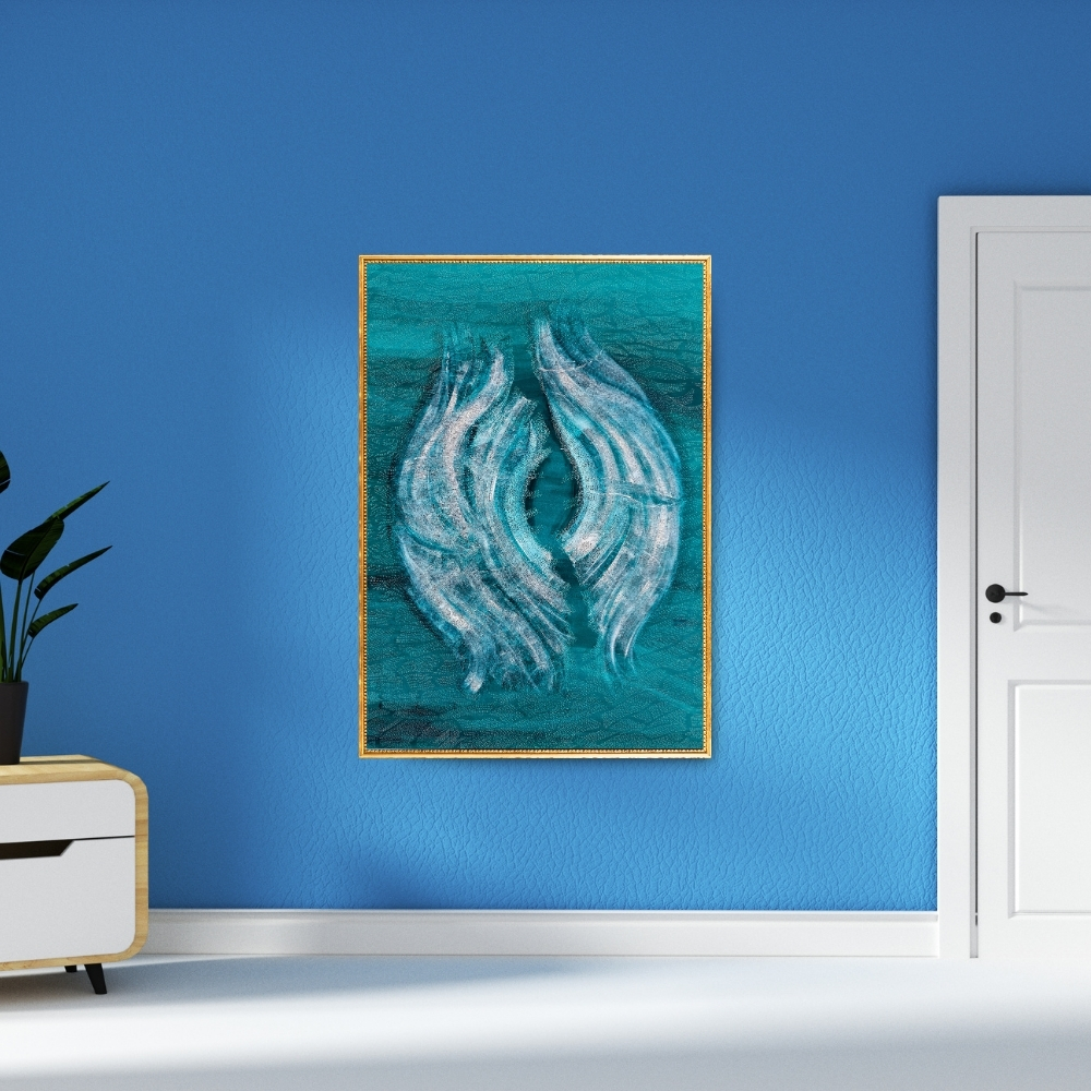 - The artist’s use of teal and white gives a sense of immersion, like looking into layers of breath and memory.
