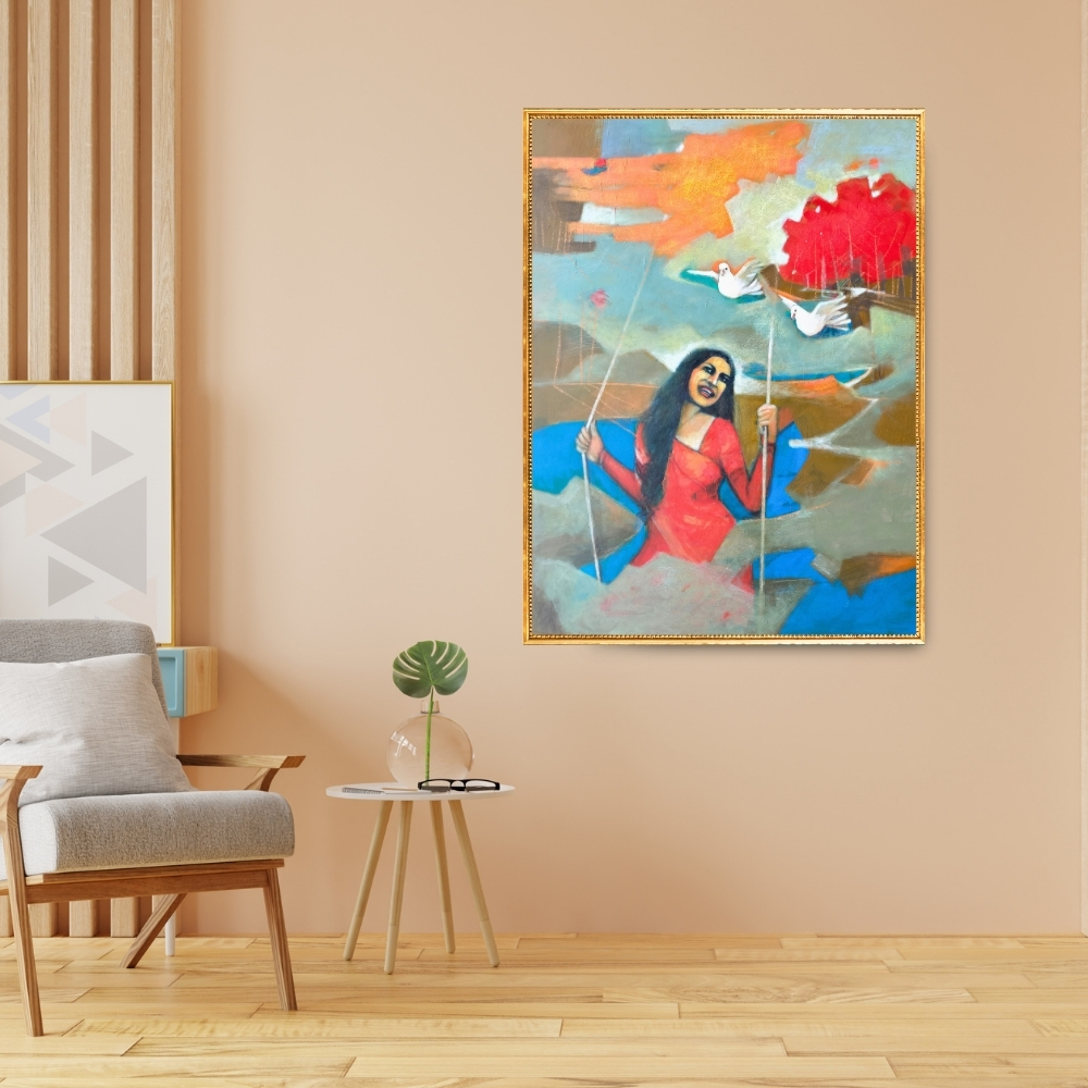 In 'Unfolding Emotions 2', Chandana Bhattacharjee paints the exuberance of a woman suspended between earth and sky. Her red dress glows like fire against the muted tones around her, as if joy itself has taken form. Two white doves soar above, mirroring her spirit in flight, while the soft geometry of colour blocks and abstract clouds carries the scene into a dream. The artist’s textured brushwork breathes motion into the stillness, making the canvas hum with quiet celebration.