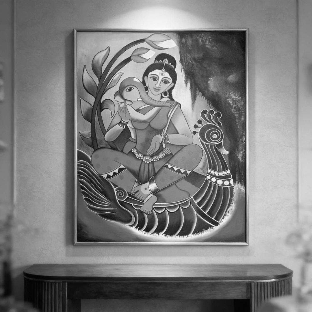 The composition is guided by balance and contrast. The human figure introduces vertical structure, while the swan’s curved form softens the visual rhythm, creating a dialogue between line and contour. The surrounding space remains minimal, allowing the interaction between the two forms to remain central. Light and tone are used sparingly, giving the figures a gentle clarity without overwhelming detail.