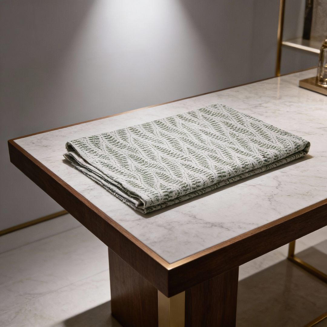 This single-sided hand block printed fabric is crafted from soft mal cotton and features a fresh green floral motif printed on the top side only. The reverse side is kept plain, giving the fabric a clean and versatile finish. Traditional hand block printing adds subtle variations to the floral pattern, creating depth and a naturally handcrafted character while keeping the design light and balanced.