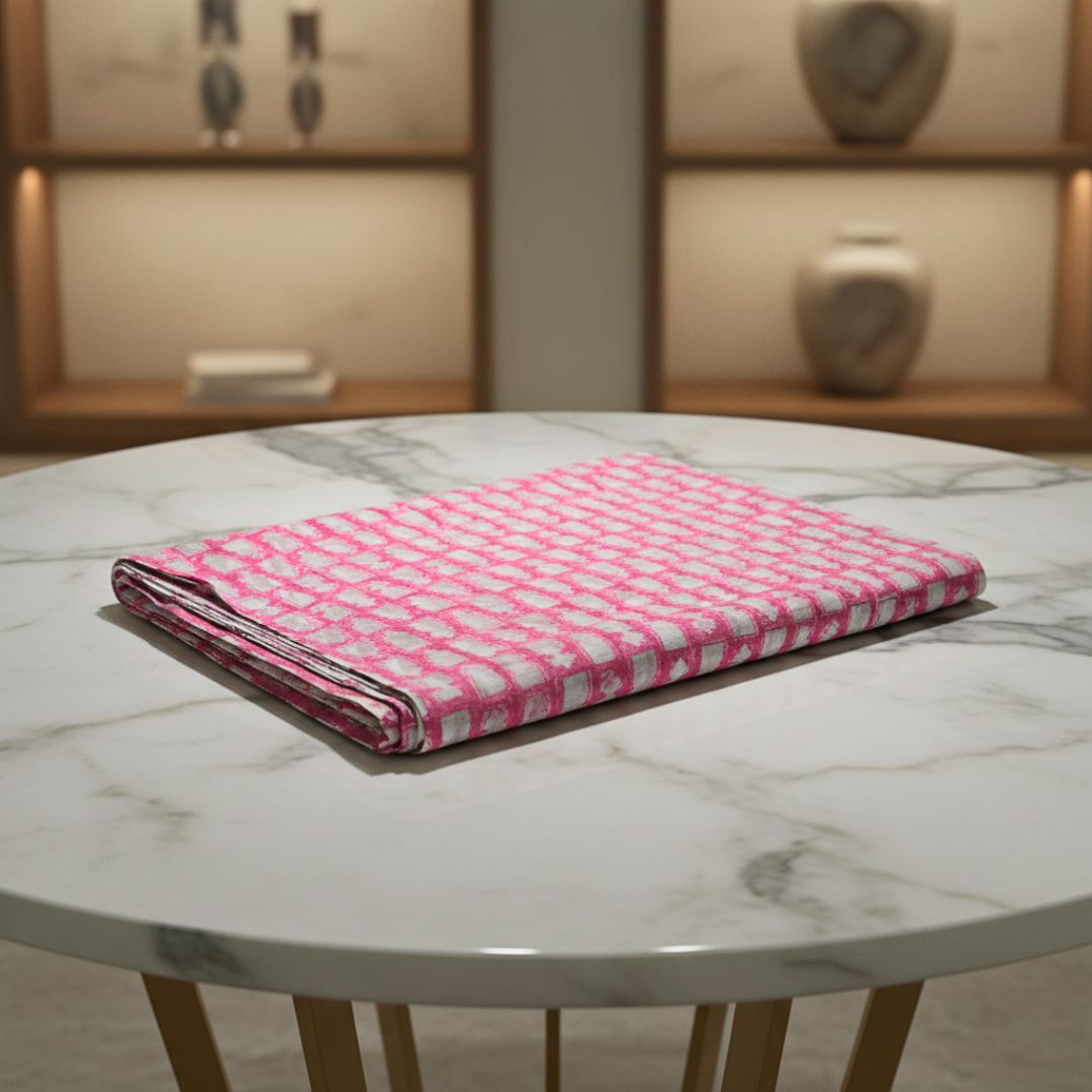 This single-sided hand block printed fabric is crafted from soft mal cotton and features a striking red geometric pattern printed on the top side only. The reverse side is kept plain, giving the fabric a clean and versatile finish. The repeating geometric motifs are created using traditional hand block printing, bringing subtle texture, rhythm, and depth that reflect true artisanal craftsmanship.