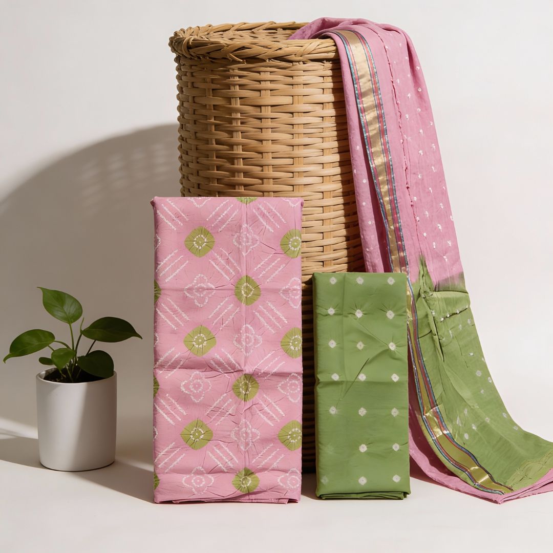 This tie and dye glace cotton suit fabric is crafted for unstitched suit sets and is meant to be stitched as per individual measurements and style preferences. The fabric features a refined hand tie and dye pattern that creates natural variations, giving each piece a unique and artisanal appearance. The subtle sheen of glace cotton adds a polished finish while keeping the fabric light and breathable.