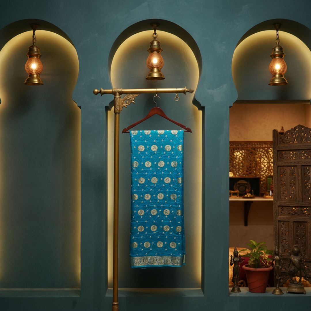 This silk Doller Silki Butta saree carries a refined visual rhythm created by delicately repeated butta motifs spread across a smooth, lustrous surface. The natural sheen of the silk enhances the intricate detailing, allowing the motifs to catch light subtly without overpowering the overall design. The balance of colour depth and pattern gives the saree a graceful presence that feels festive, polished, and deeply rooted in classic Indian aesthetics.