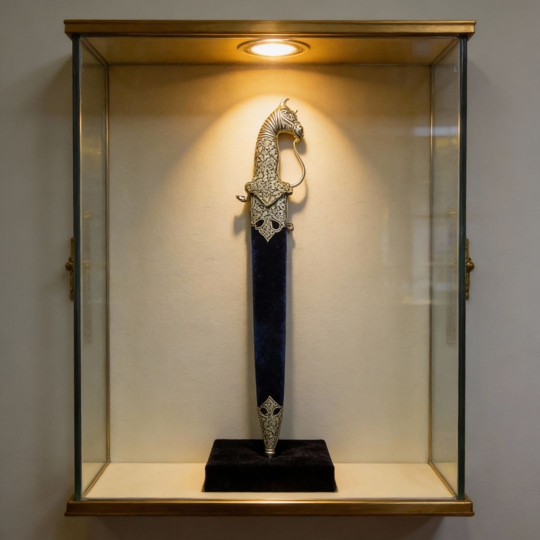 Created as a decorative art object, this dagger is suited for collectors who appreciate heritage craftsmanship and subtle statement pieces. It fits seamlessly into display shelves, study interiors, or curated art collections where form and material matter. The craftsmanship reflects the patience and discipline of Koftgari work, where every motif is embedded by hand to create lasting texture and visual depth.