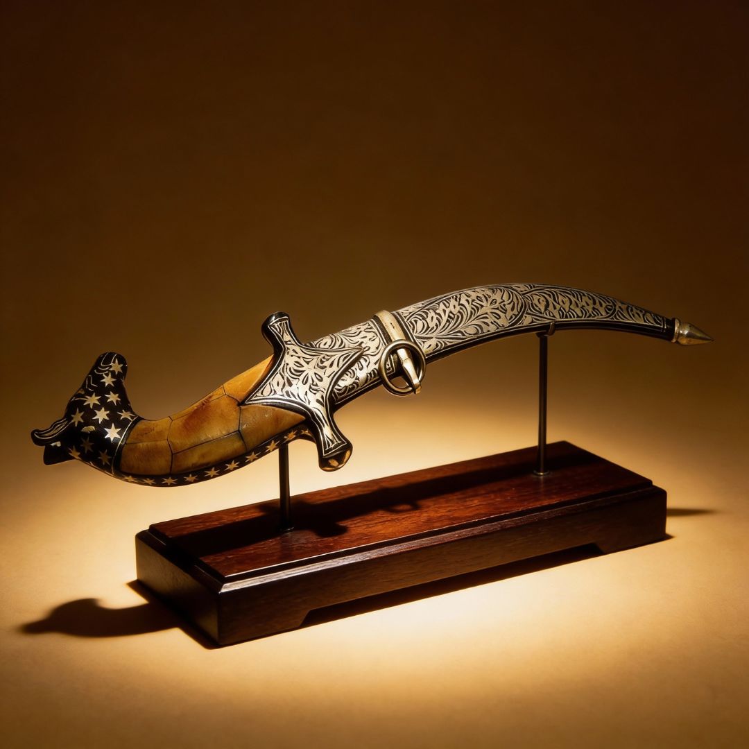 Designed as a collectible rather than a functional weapon, this dagger carries strong cultural and decorative value. It suits art-led interiors, curated collections, and heritage displays that appreciate craftsmanship over utility. The measured proportions, combined with careful detailing, make it a compact yet striking example of Koftgari art that rewards close viewing.