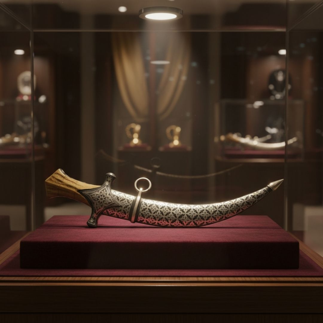 Created as a collectible and display object, this Koftgari dagger reflects the ceremonial and artistic side of traditional arms rather than functional combat use. It fits naturally into curated art collections, heritage displays, or interiors that appreciate historical craft forms. The balance of form, material, and ornamentation makes it a compelling example of Koftgari artistry, valued for its craftsmanship and cultural presence.