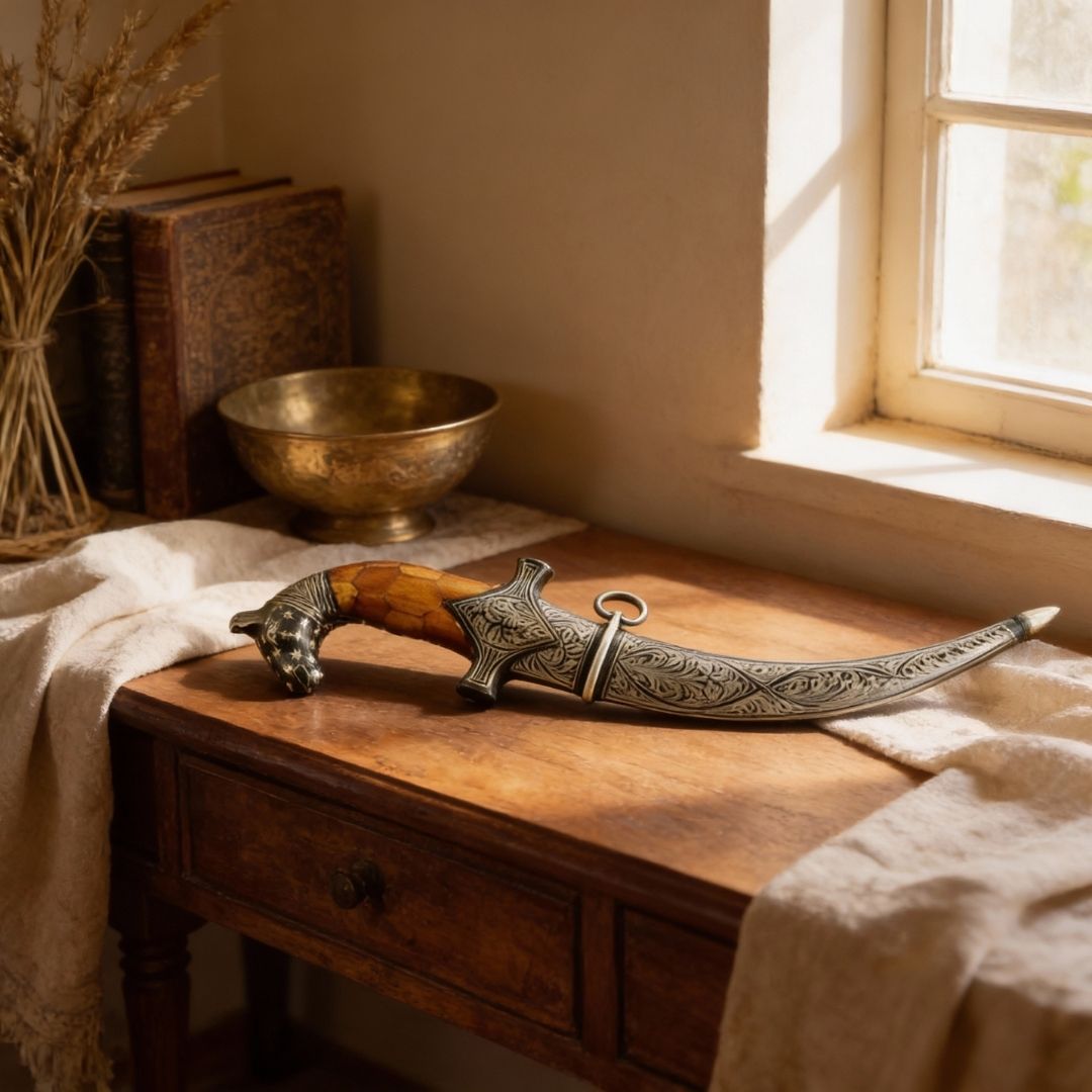 The bone handle adds a distinct contrast to the metal, bringing warmth and organic character to the overall design. Crafted as a decorative artefact, this dagger is suited for collectors, heritage décor settings, and curated interior displays. It represents Koftgari craftsmanship as an art form, where precision, restraint, and material harmony take precedence over utility.