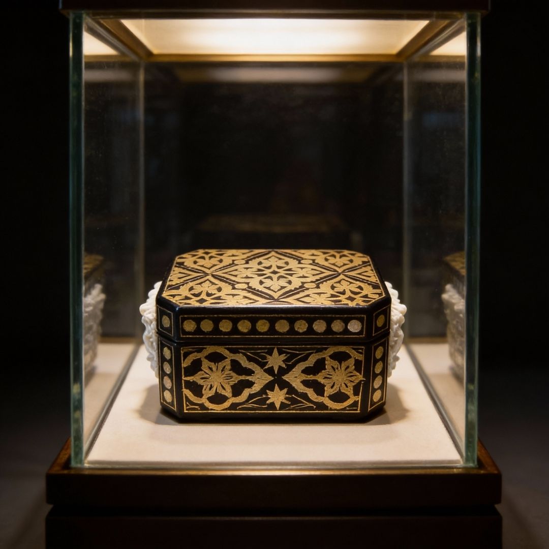 Designed for both display and light utility, this Koftgari box works beautifully as a keepsake holder, trinket box, or accent object in curated interiors. It fits naturally into study tables, shelves, coffee table styling, or collector cabinets where small objects carry cultural weight. The piece appeals to those who value heritage craft presented in a restrained, functional format that still carries strong visual presence.