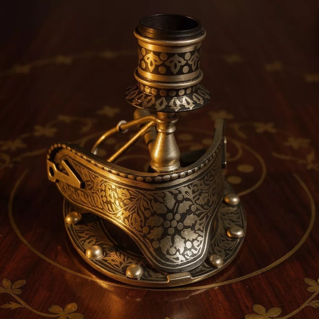 This Good Luck decorative piece is a finely crafted Koftgari artwork that brings together the symbolic horseshoe, whip, and candle stand in a balanced and harmonious composition. Each element is shaped with care and finished using traditional metal inlay techniques, allowing the detailing to enhance the form without appearing excessive. The design reflects cultural symbolism, craftsmanship, and restraint, giving the piece a composed and meaningful presence.