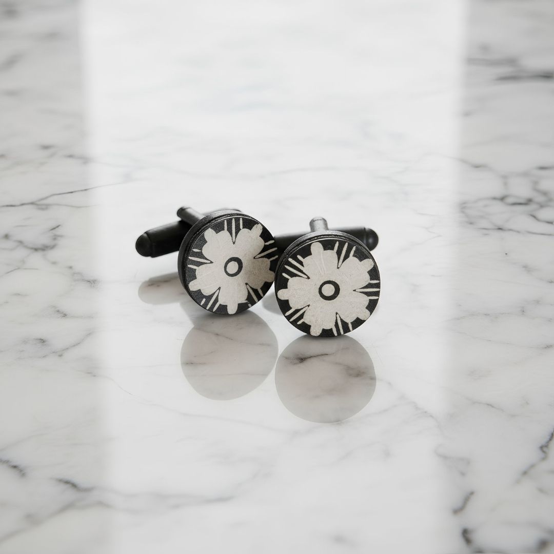 These decorative cufflink buttons are a refined expression of handcrafted metal art, created with careful attention to proportion, finish, and surface detailing. Each piece is shaped and finished by hand, allowing the metalwork to highlight craftsmanship without excessive ornamentation. The design balances simplicity with elegance, giving the cufflinks a composed and timeless character suitable for formal use.