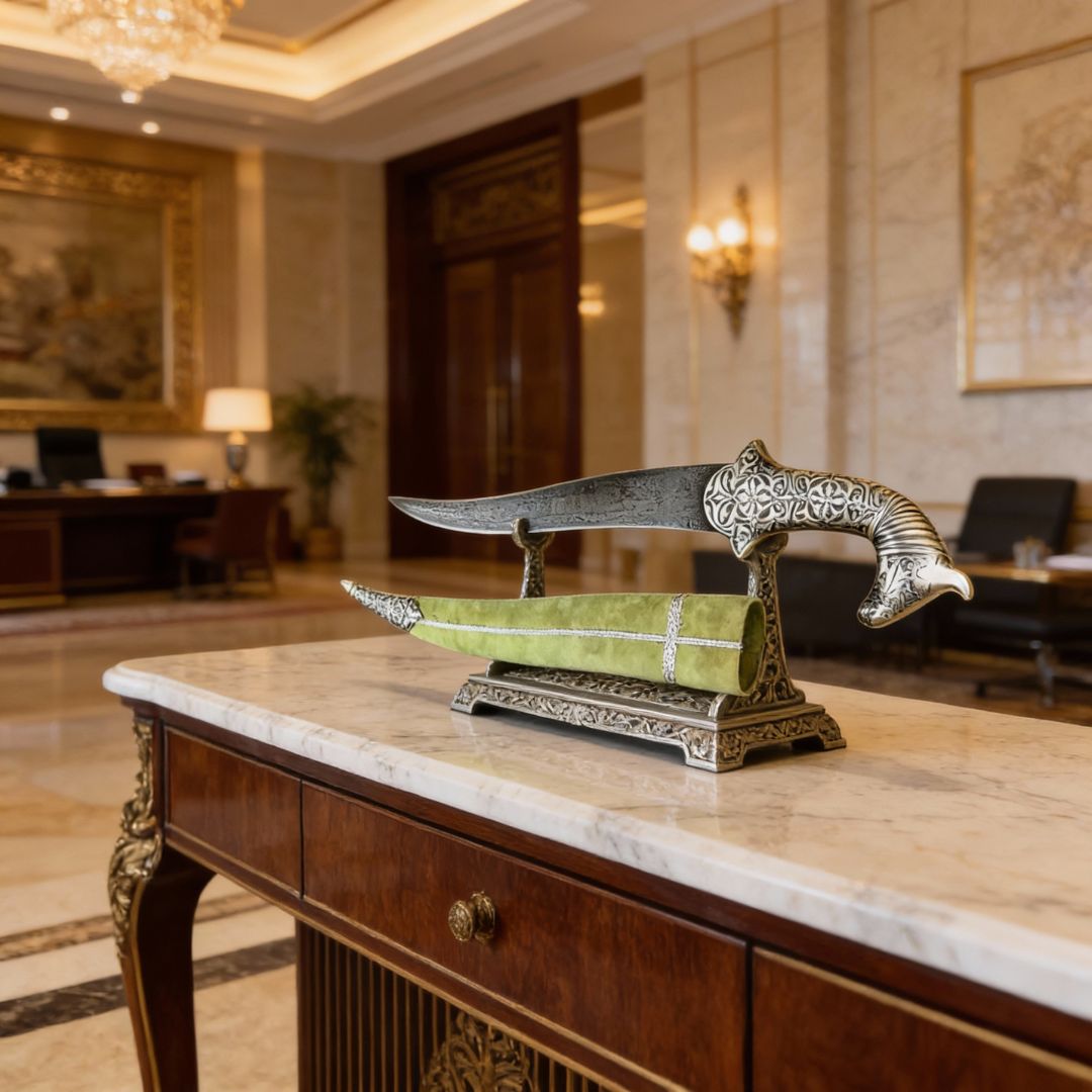 Created as a decorative artefact, this Koftgari dagger is well suited for heritage-inspired interiors, curated collections, and display spaces that value symbolic craftsmanship. It works well in study rooms, libraries, or display cabinets, carrying a quiet authority and cultural presence. The piece is intended for appreciation and visual storytelling rather than functional use.
